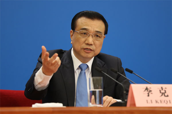 3月15日上午,国务院总理李克强在人民大会堂三楼金色大厅会见采访十二届全国人大五次会议的中外记者并回答记者提出的问题。图为国务院总理李克强回答记者提问。中国人大网 罗荣 摄