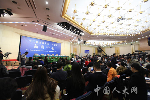 3月14日下午,十二届全国人大一次会议在梅地亚中心举行记者会,医药卫生体制改革领导小组负责人就“医药卫生体制改革”的相关问题回答中外记者的提问。图为记者会即将开始。罗荣 摄