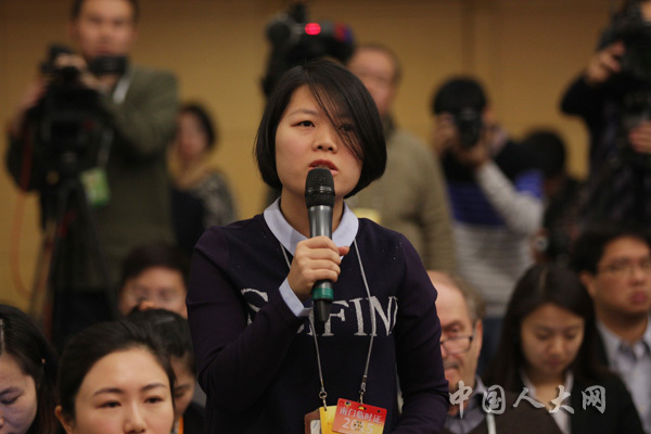 3月6日上午,十二届全国人大三次会议在梅地亚中心举行记者会,财政部部长楼继伟、副部长刘昆就“财政工作和财税改革”的相关问题回答中外记者的提问。图为新华社、新华网记者提问。中国人大网 罗荣 摄