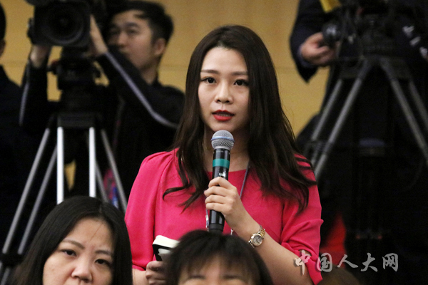 3月7日上午,十二届全国人大五次会议在梅地亚中心举行记者会,财政部部长肖捷、财政部部长助理戴柏华就“财政工作和财税改革”的相关问题回答中外记者的提问。图为法制晚报记者提问。中国人大网 罗荣 摄