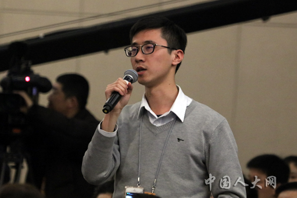 3月7日上午,十二届全国人大五次会议在梅地亚中心举行记者会,财政部部长肖捷、财政部部长助理戴柏华就“财政工作和财税改革”的相关问题回答中外记者的提问。图为中国网记者提问。中国人大网 罗荣 摄