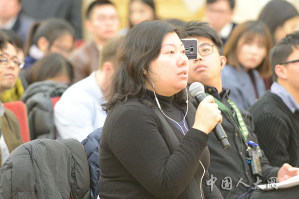 11月7日上午,十二届全国人大常委会第二十四次会议闭幕后,全国人大常委会办公厅在人民大会堂台湾厅召开新闻发布会,全国人大常委会法工委、全国人大常委会香港基本法委员会、国家互联网信息办公室、国家新闻出版广电总局、教育部等相关部门负责人出席,共同回答刚表决通过的网络安全法、民办教育促进法修正案、电影产业促进法、海洋环境保护法修正案、香港特别行政区基本法第一百零四条的解释等有关问题。图为香港电台记者提问。中国人大网 马冬潇 摄