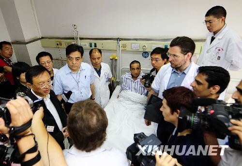 5月30日,外交部长杨洁篪在成都看望援华救灾的国际医疗队。这是杨洁篪(左)在四川省人民医院看望古巴医疗队。 新华社记者 任勇摄