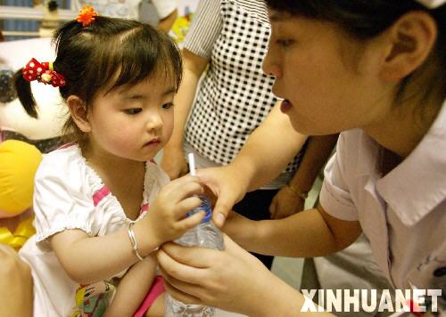 5月31日,江苏省人民医院的护士在爱心病房喂宋馨懿喝水。当日傍晚,四川地震灾区小伤员宋馨懿来到南京,进入江苏省人民医院接受身体和心理的康复治疗,并为安装假肢做准备。 5月14日,在地震后的四川北川县城,被压在垮塌房屋下的3岁小女孩宋馨懿,在遇难父母的身体翼护下与死神抗争了40多个小时后获救。在医疗队和社会各界关照下,小馨懿的身心恢复状况良好。新华社记者孙参摄