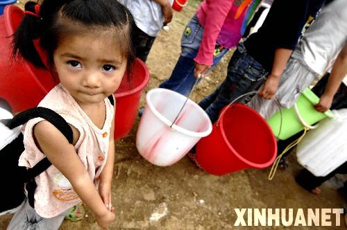 5月29日,在北川县香泉镇黄江村安置点,一名小女孩跟着母亲排队领取饮用水。灾难让众多从废墟中站起来的灾区的孩子学会了分担大人的忧伤、学会了把痛苦和悲伤丢到脑后,把不幸和忧愁踩在脚下,人们为这些将在抗震救灾中迎接六一国际儿童节的孩子们送来深深的祝福:绽放纯真的笑容,孩子们,节日快乐!新华社记者 岳月伟 摄