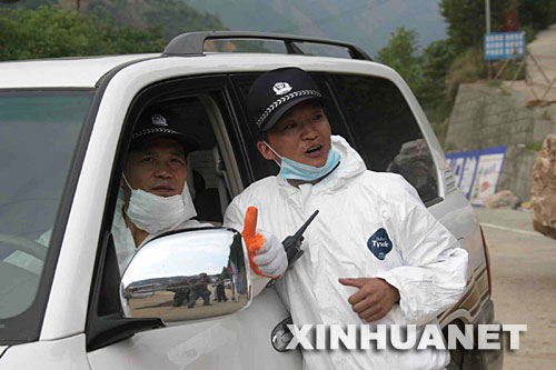 6月9日,绵阳市公安局民警徐根发(左)和在北川县城外警戒执勤的特警战士交流情况。 新华社记者汪永基摄