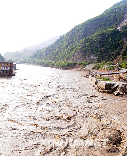6月10日,唐家山堰塞湖泄洪后,滚滚浊浪从北川县通口镇附近流过。通口镇是距离唐家山堰塞湖最近的一个镇。新华社记者 肖春飞摄