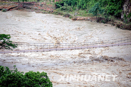 6月10日,唐家山堰塞湖泄洪后,滚滚浊浪从北川县通口镇的铁索桥下流过。通口镇是距离唐家山堰塞湖最近的一个镇。新华社记者肖春飞 摄