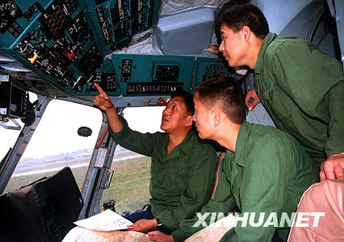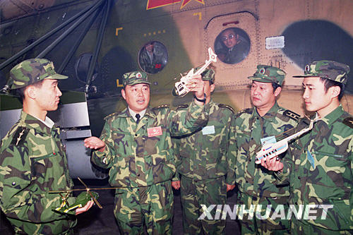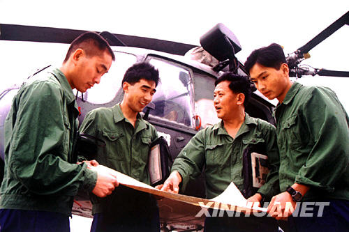2004年,邱光华(右二)在成都某机场与同事一起总结飞行经验。 新华社发(黄鹏 摄)