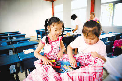 6月22日,都江堰市太平街小学二年级的林佩璇(左)在帮同学杨苏琪整理文具。6月23日,都江堰市约7万名学生将在45个教学点全面复课。