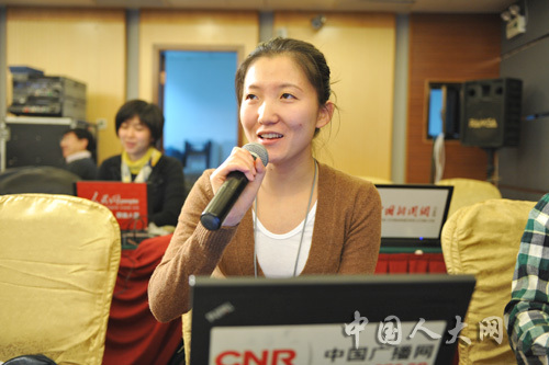 3月11日晚,十一届全国人大五次会议新闻中心组织11家网站,联合开展主题为“充分发挥审判职能作用,努力推进社会管理创新”的网络访谈,邀请3位在地方法院工作的全国人大代表,结合听取和审议最高人民法院工作报告,与网民进行在线交流。图为中国广播网代表网友提问。中国人大网 李杰 摄